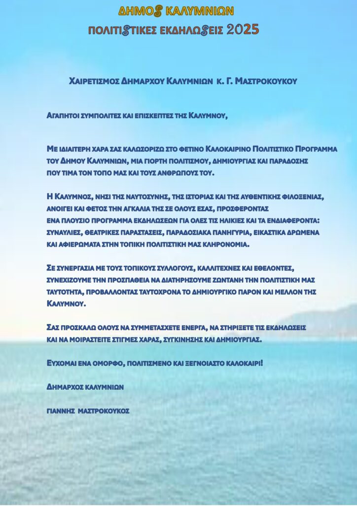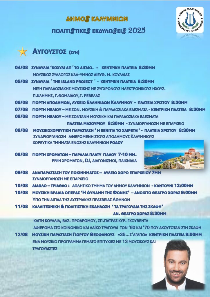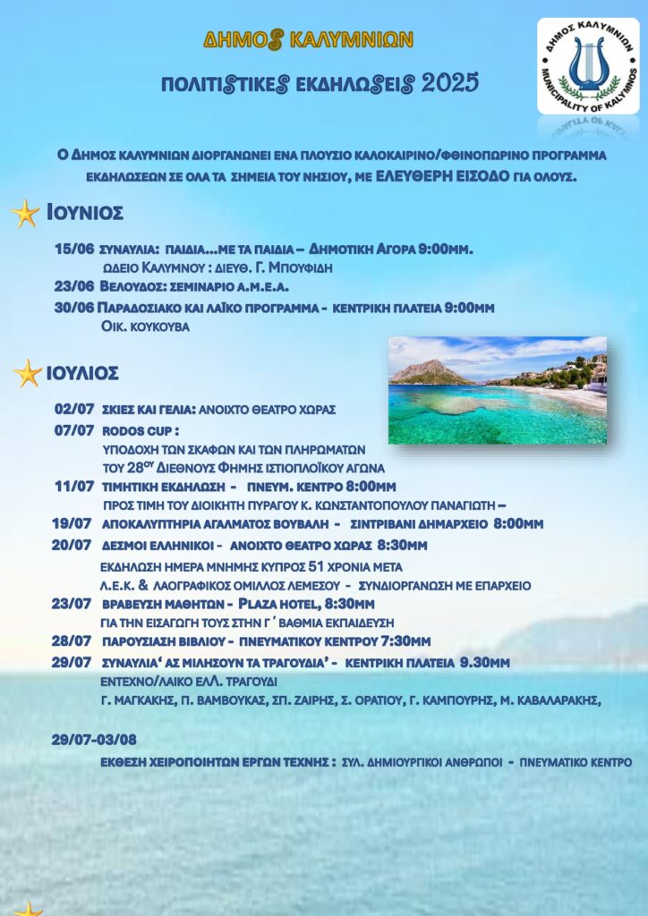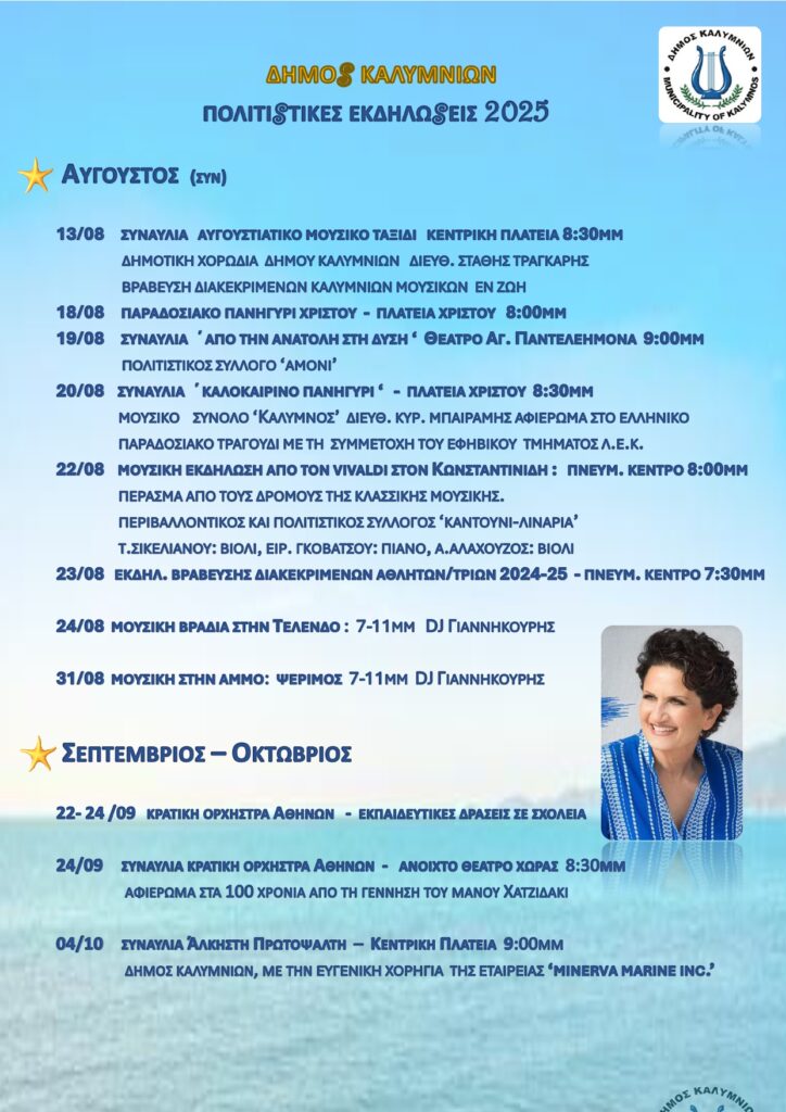 Ένα πλούσιο Πολιτιστικό Καλοκαίρι και Φθινόπωρο, περιμένει ντόπιους και επισκέπτες , που διοργανώνει ο Δήμος Καλυμνίων, το οποίο ήδη ξεκίνησε και θα ολοκληρωθεί στις 4 Οκτωβρίου, με την μεγάλη Συναυλία της Άλκηστις Πρωτοψάλτη, στην κεντρική πλατεία της Καλύμνου.