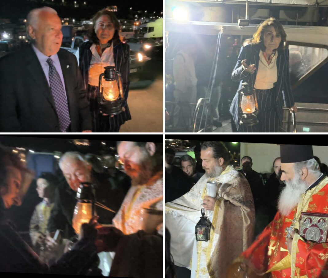 Η Αντιδήμαρχος Τουρισμού, Καλλιόπη Κουτούζη, συγκινημένη συνόδευσε το Άγιο Φως και το παρέδωσε στο λιμάνι στους ιερείς, π. Ισίδωρο και π. Κωνσταντίνο, ενώ στην υποδοχή ήταν ο πρόεδρος του Δημοτικού Συμβουλίου, Δημήτρης Μαραγκός, ο Διοικητής του Συντάγματος, αστυνομικές και λιμενικές αρχές και παρελήφθη από όλες τις ενορίες, για να μεταφερθεί στις εκκλησίες και στον Μητροπολιτικό Ναό, από τον εφημέριο, π. Ισίδωρο Γλυνατση.