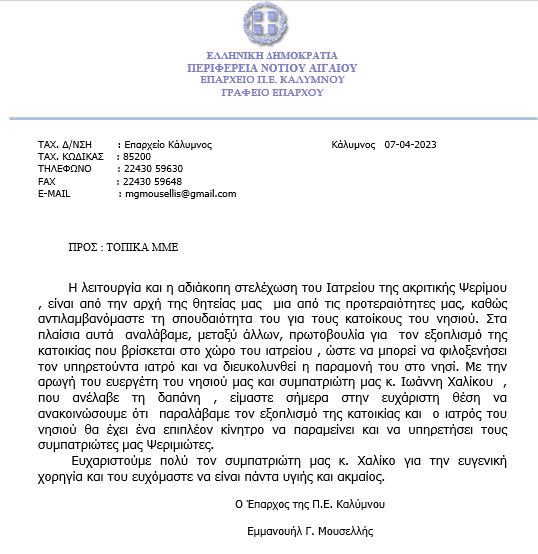 Ο Έπαρχος Καλύμνου, Μανώλης Μουσελλής, ανακοινώνει ότι παρελήφθει σήμερα ο εξοπλισμός για την κατοικία του γιατρού, που υπηρετεί στο ιατρείο του ακριτικού νησιού, ο οποίος αγοράστηκε με δαπάνες του Γιάννη Χαλίκου, τον οποίο ευχαριστεί για αυτή την ευγενική του χορηγία και εκφράζει την πεποίθηση ότι θα συμβάλει τα μέγιστα ώστε ο γιατρός να παραμείνει στο νησί και να προσφέρει τις ιατρικές του υπηρεσίες στους λιγοτούς Ψεριμιώτες, αλλά και στους πολλούς επισκέπτες που θα αρχίσουν να κατακλύζουν την μοναδικης ομορφιάς Ψέριμο.