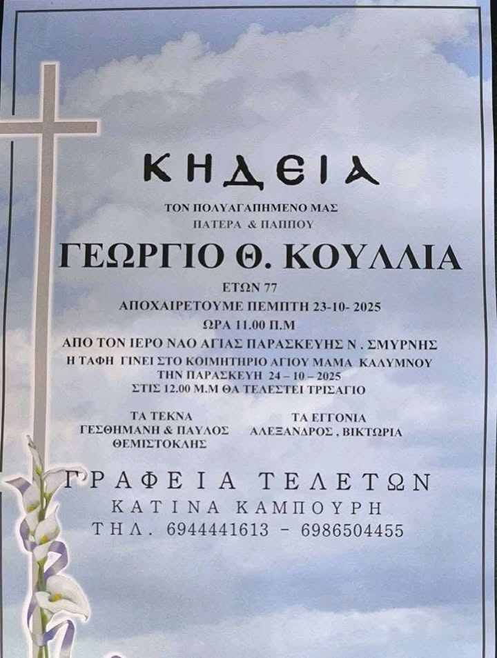 Στην ιδιαίτερή του πατρίδα, την Κάλυμνο, θα αναπαυθεί ο 77χρονος Γεώργιος Κουλλιάς, καθώς η ταφή του θα γίνει την Παρασκευή 24 Οκτωβρίου 2025, στο κοιμητήριο του Αγίου Μάμα.