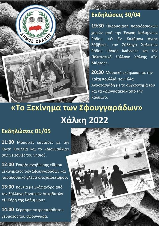 ο Δήμος Χάλκης σε συνεργασία με το Σύλλογο Γυναικών Αυτοδυτών «Η Κόρη της Καλύμνου», την Ένωση Καλυμνίων Ρόδου «Ο Εν Καλύμνω Άγιος Σάββας», τον Σύλλογο Χαλκιτών Ρόδου «Άγιος Ιωάννης» και τον Πολιτιστικό Σύλλογο Χάλκης «Το Μύρτος» πραγματοποιείσαι το Σάββατο 30 Απριλίου και την Κυριακή 1η Μαΐου 2022, σειρά εκδηλώσεων για την αναβίωση του εθίμου «ΤΟ ΞΕΚΙΝΗΜΑ ΤΩΝ ΣΦΟΥΓΓΑΡΑΔΩΝ» με ακριβή περιγραφή της διαδικασίας του ξεκινήματος των σφουγγαράδικων καϊκιών για τις ακτές της Αφρικής, τον προηγούμενο αιώνα.