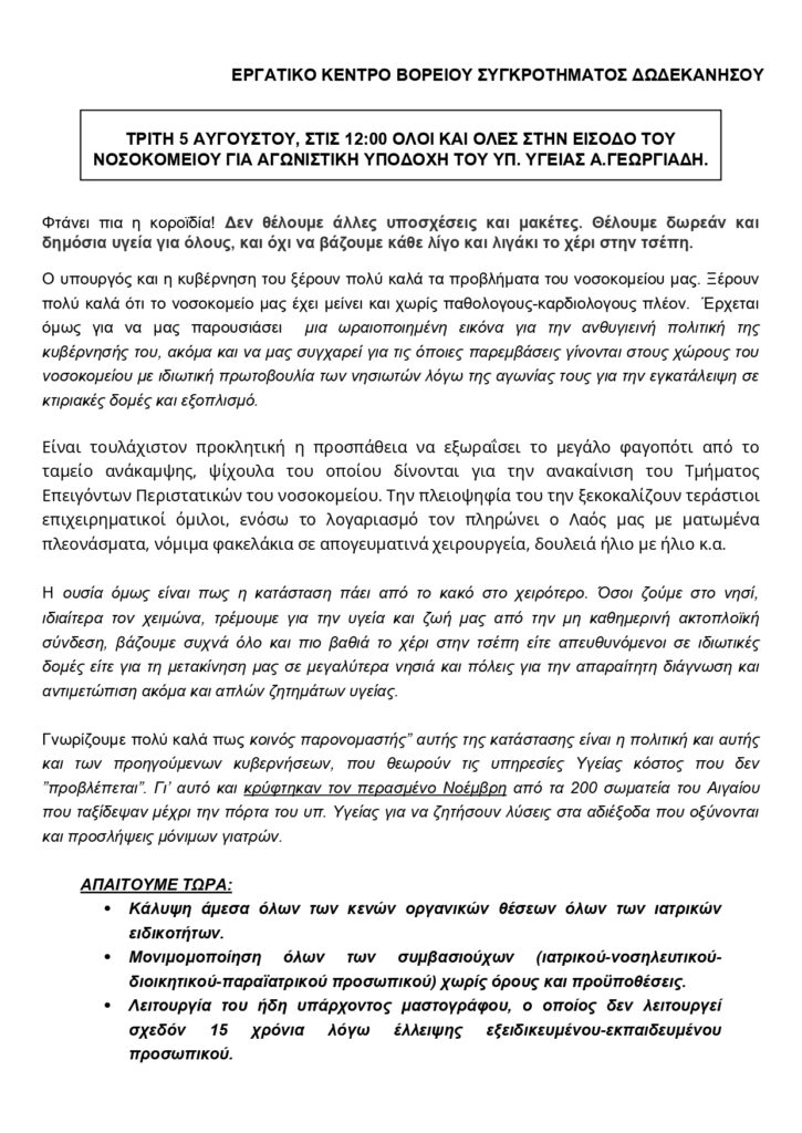 Το Εργατικό Κέντρο Β. Δωδεκανήσου και ο Σύλλογος Εργαζομένων του Νοσοκομείου Καλύμνου, καλούν σε αγωνιστική κινητοποίηση, αύριο Τρίτη 5 Αυγούστου, στις 12:00, κατά την άφιξη του Υπουργού Υγείας, Άδωνι Γεωργιάδη στην Κάλυμνο.