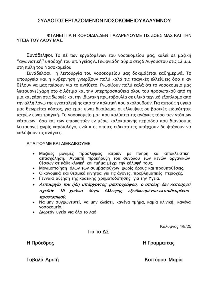 Ακολουθούν οι ανακοινώσεις του Εργατικού Κέντρου και του Συλλόγου Εργαζομένων Νοσοκομείου Καλύμνου