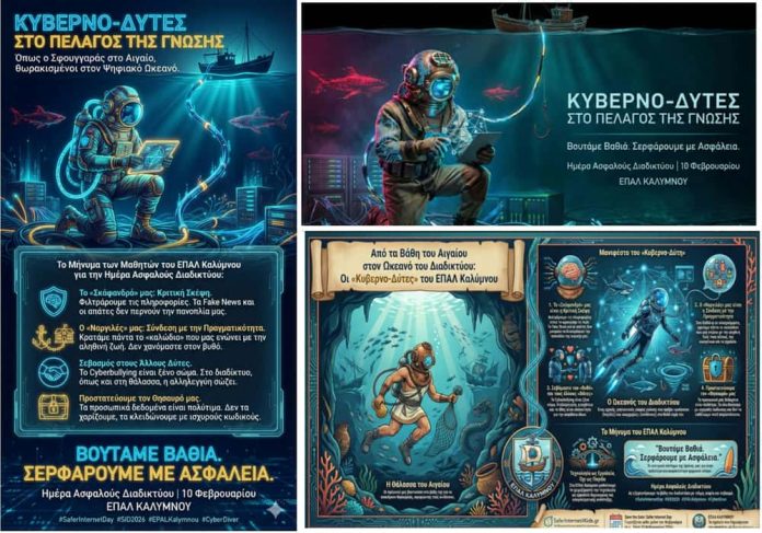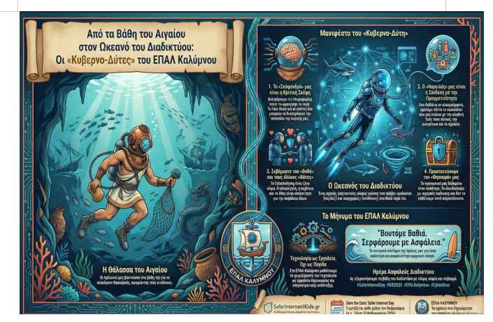 Στην Κάλυμνο, ξέρουμε καλά τι σημαίνει «βουτιά». Είναι στο DNA μας. Οι παππούδες μας φορούσαν το βαρύ σκάφανδρο και βυθίζονταν στο απέραντο γαλάζιο για να ανασύρουν θησαυρούς, αψηφώντας τους κινδύνους. Σήμερα, 10 Φεβρουαρίου, Ημέρα Ασφαλούς Διαδικτύου, εμείς, οι μαθητές του ΕΠΑΛ Καλύμνου, φοράμε τον δικό μας εξοπλισμό και βουτάμε σε έναν άλλο ωκεανό: τον Ψηφιακό.