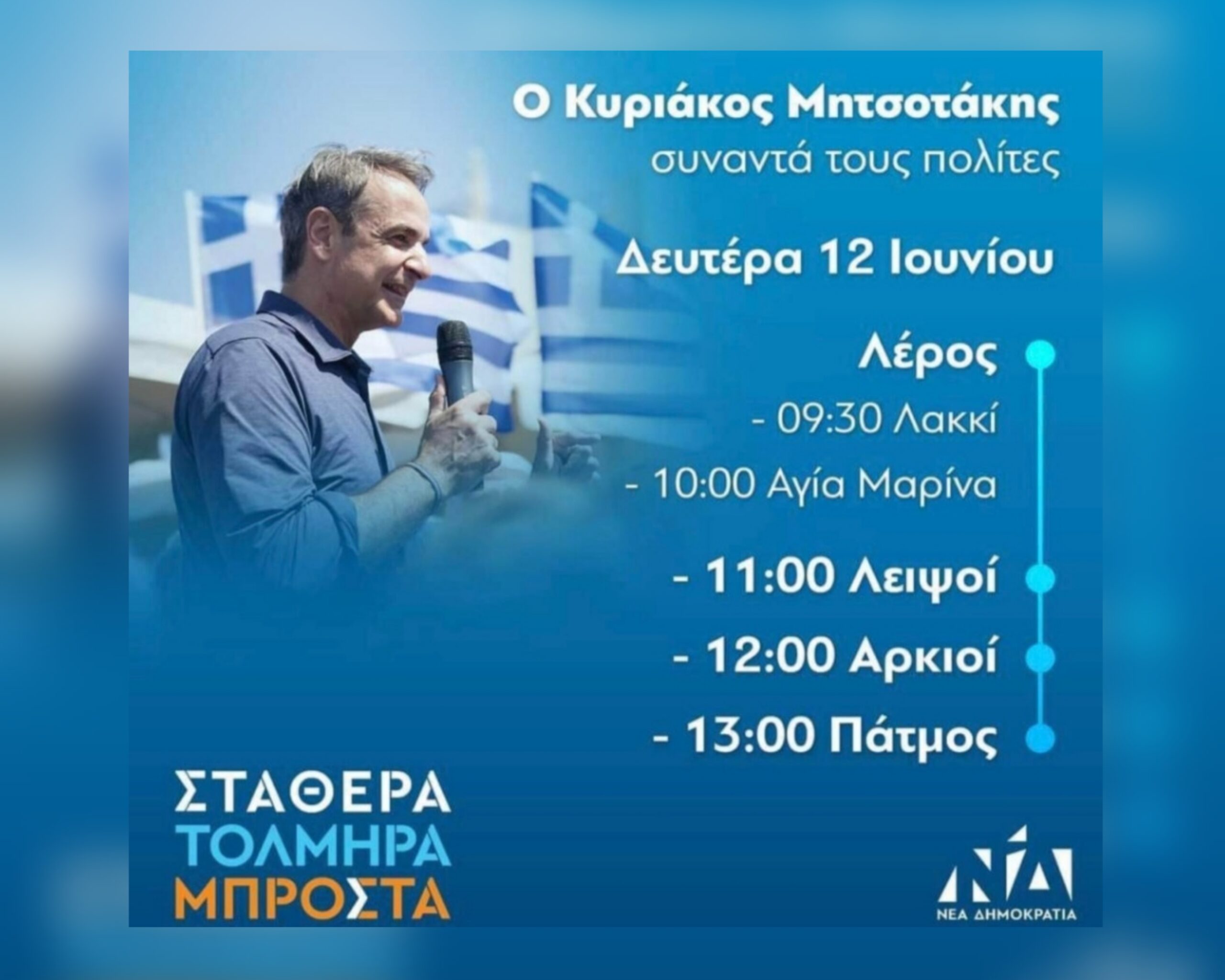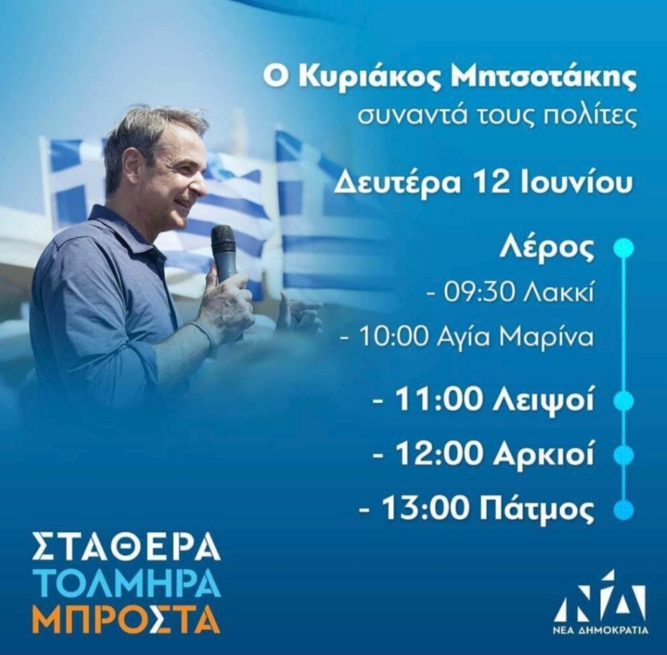“Ο Πρόεδρος της Νέας Δημοκρατίας Κυριάκος Μητσοτάκης θα συναντήσει και θα συζητήσει με τους πολίτες τη Δευτέρα 12/6/2023. Σας περιμένουμε α) στη Λέρο στις 9:30 στο Λακκί και στις 10:00 στην Αγία Μαρίνα, β) στους Λειψούς στις 11:00, γ) στους Αρκιούς στις 12:00 και δ) στην Πάτμο στις 13:00”.