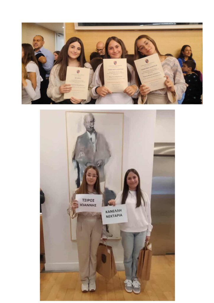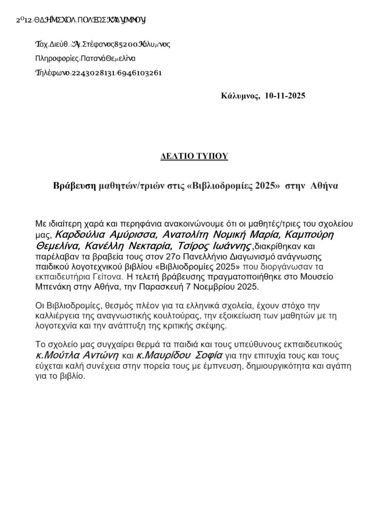 Με ιδιαίτερη χαρά και περηφάνια ανακοινώνουμε ότι οι μαθητές/τριες του σχολείου μας, Καρδούλια Αμύρισσα, Ανατολίτη Νομική Μαρία, Καμπούρη Θεμελίνα, Κανέλλη Νεκταρία, Τσίρος Ιωάννης,διακρίθηκαν και παρέλαβαν τα βραβεία τους στον 27ο Πανελλήνιο Διαγωνισμό ανάγνωσης παιδικού λογοτεχνικού βιβλίου «Βιβλιοδρομίες 2025» που διοργάνωσαν τα εκπαιδευτήρια Γείτονα. Η τελετή βράβευσης πραγματοποιήθηκε στο Μουσείο Μπενάκη στην Αθήνα, την Παρασκευή 7 Νοεμβρίου 2025.