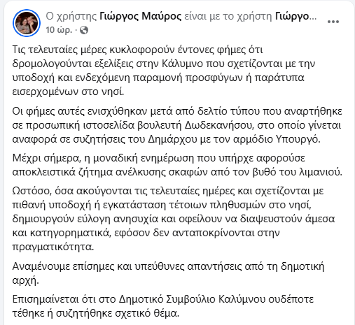 Ο Γιώργος Μαύρος σε χθεσινή του ανάρτηση στο Facebook, αναφέρθηκε σε φήμες “ότι δρομολογούνται εξελίξεις που σχετίζονται με την υποδοχή και ενδεχόμενη παραμονή προσφύγων ή παράτυπα εισερχομένων στο νησί”, οι οποίες, όπως τονίζει “ενισχύθηκαν από δ.τ. βουλευτή Δωδεκανήσου” (αναφέρεται στον Γιάννη Παππά)