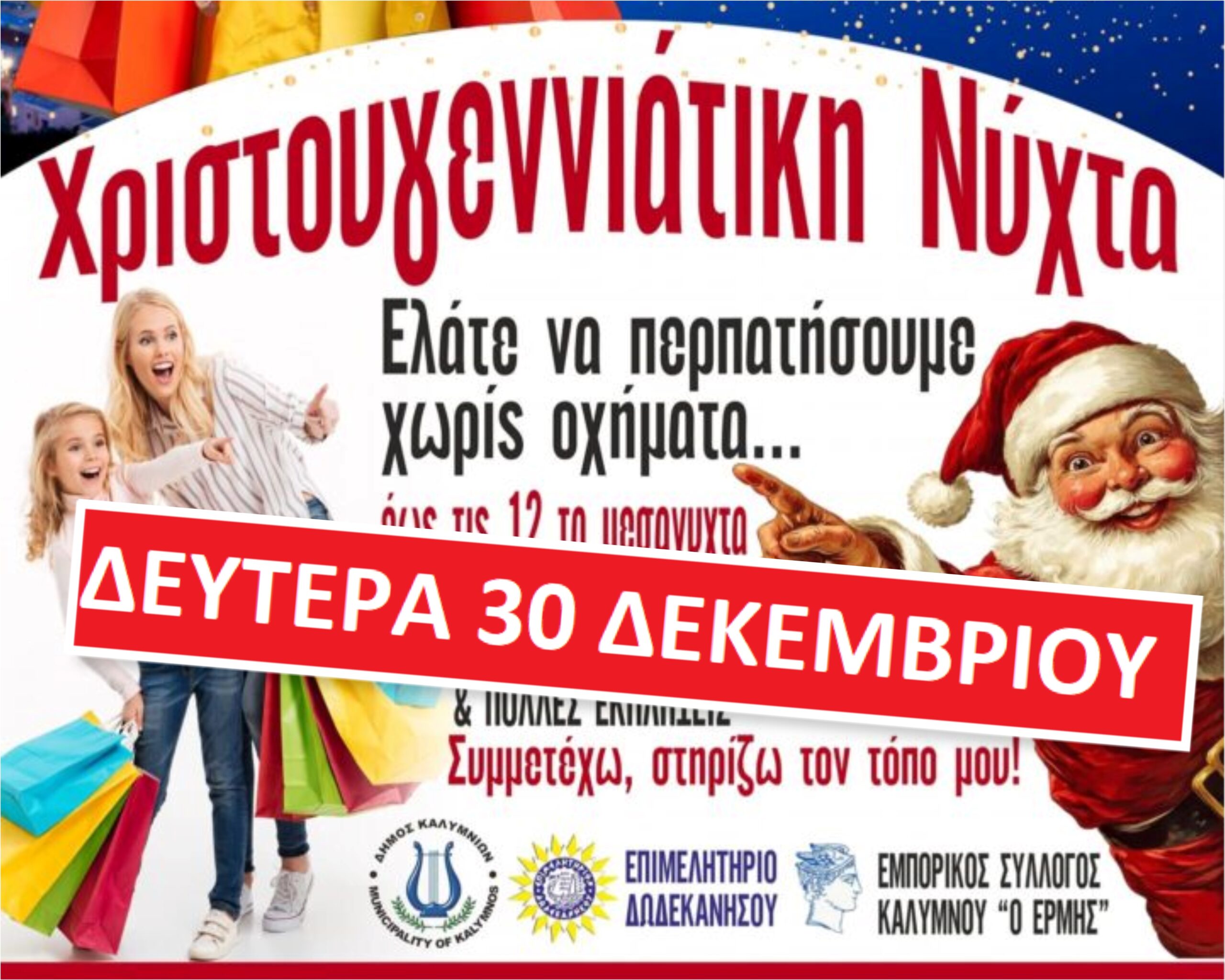 Σύμφωνα με ανακοίνωση του Εμπορικού Συλλόγου, η προγραμματισμένη για σήμερα Παρασκευή (εξ αναβολής) εκδήλωση “Χριστουγεννιάτικη Νύχτα”, μετατίθεται για την Δευτέρα 30 Δελεμβρίου, σύμφωνα και με την ανακοίνωση που ακολουθεί: