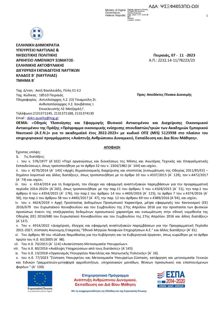 «Οδηγός Υλοποίησης και Εφαρμογής Φυσικού Αντικειμένου και Διαχείρισης Οικονομικού Αντικειμένου της Πράξης «Πρόγραμμα οικονομικής ενίσχυσης σπουδαστών/τριών των Ακαδημιών Εμπορικού Ναυτικού (Α.Ε.Ν.)» για το ακαδημαϊκό έτος 2022-2023» με κωδικό ΟΠΣ (MIS) 5123938 στο πλαίσιο του επιχειρησιακού προγράμματος «Ανάπτυξη Ανθρώπινου Δυναμικού, Εκπαίδευση και Δια Βίου Μάθηση»