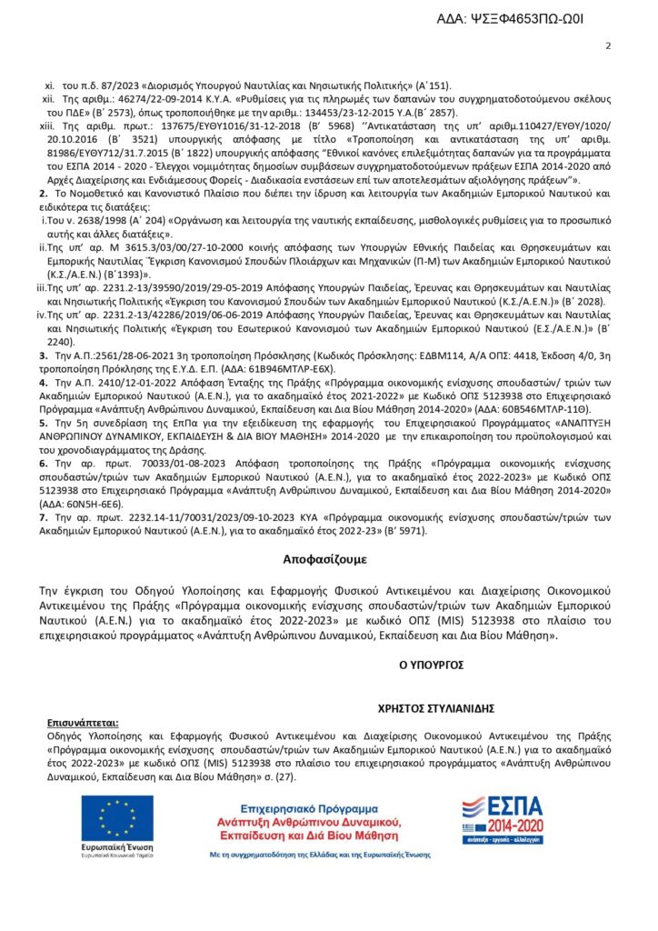 Εγκρίθηκε στις 15.11.2023, από τον Υπουργό Ναυτιλίας και Νησιωτικής Πολιτικής, Χρήστο Στυλιανίδη, η 1η τροποποίηση του Οδηγού Υλοποίησης και Εφαρμογής Φυσικού Αντικειμένου και Διαχείρισης Οικονομικού Αντικειμένου της Πράξης «Πρόγραμμα οικονομικής ενίσχυσης σπουδαστών/τριών των Ακαδημιών Εμπορικού Ναυτικού (Α.Ε.Ν.) για το ακαδημαϊκό έτος 2022-2023» με κωδικό ΟΠΣ (MIS) 5123938, στο πλαίσιο του επιχειρησιακού προγράμματος «Ανάπτυξη Ανθρώπινου Δυναμικού, Εκπαίδευση και Δια Βίου Μάθηση» (ΑΔΑ: ΨΣΞΦ4653ΠΩ-Ω0Ι). Ειδικότερα: