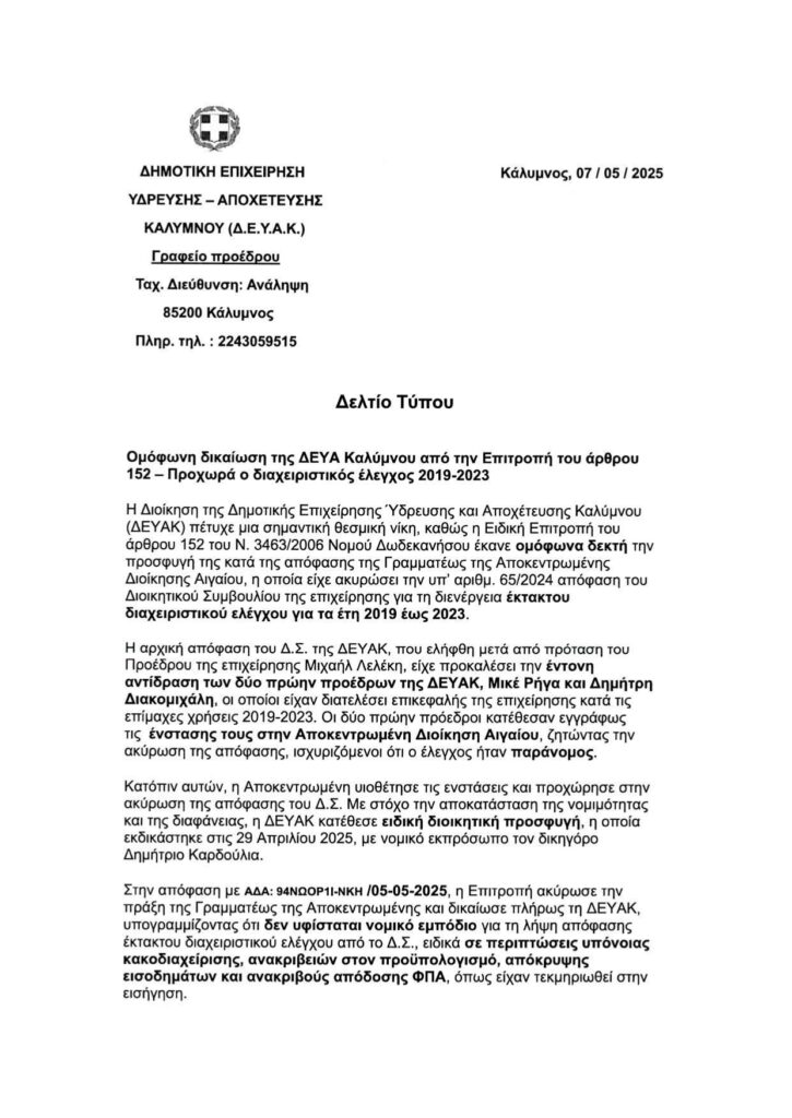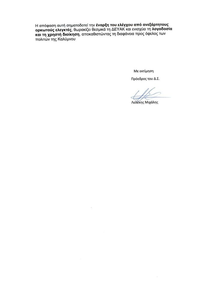 Για “μεγάλη νίκη” της διοίκησης της ΔΕΥΑΚ, αναφέρεται το δελτίο τύπου και επισημαίνεται πως εξέλιπαν τα εμπόδια για την λήψη απόφασης από το Δ.Σ. για έκτακτου διαχειριστικού ελέγχου, ειδικά σε περιπτώσεις, όπως αναφέρει το δ.τ., όπου υπάρχουν υπόνοιες “κακοδιαχείρισης, ανακριβειών στον προϋπολογισμό, απόκρυψης εισοδημάτων και ανακριβούς απόδοσης του ΦΠΑ” και καταλήγει πως ο διαχειριστικός έλεγχος από ανεξάρτητους ορκωτούς ελεγκτές, “αποκαθιστά την διαφάνεια προς όφελος των πολιτών της Καλύμνου”