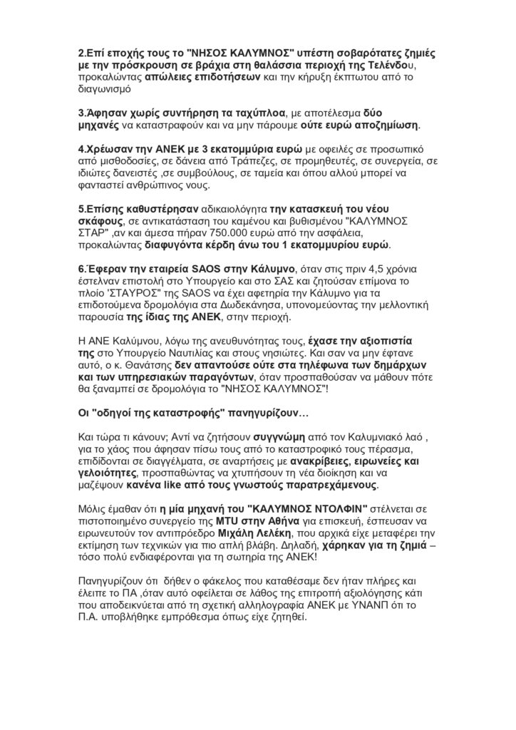 Η διοίκηση της εταιρείας υπογραμμίζει πως “αντί να ζητήσουν συγγνώμη από τον Καλυμνιακό λαό , για το χάος που άφησαν πίσω τους από το καταστροφικό τους πέρασμα, επιδίδονται σε διαγγέλματα, σε αναρτήσεις με ανακρίβειες, ειρωνείες και γελοιότητες,” και προσθέτει πως σήμερα “οι οδηγοί της καταστροφής πανηγυρίζουν”, ενώ καταλήγει: “Είμαστε εδώ για να σώσουμε την ΑΝΕΚ, όχι για να καλύψουμε τις πράξεις τους. Και σύντομα, θα πάρουν απαντήσεις για τα χρέη, τις χαμένες επιδοτήσεις και τις καταστροφικές τους επιλογές”