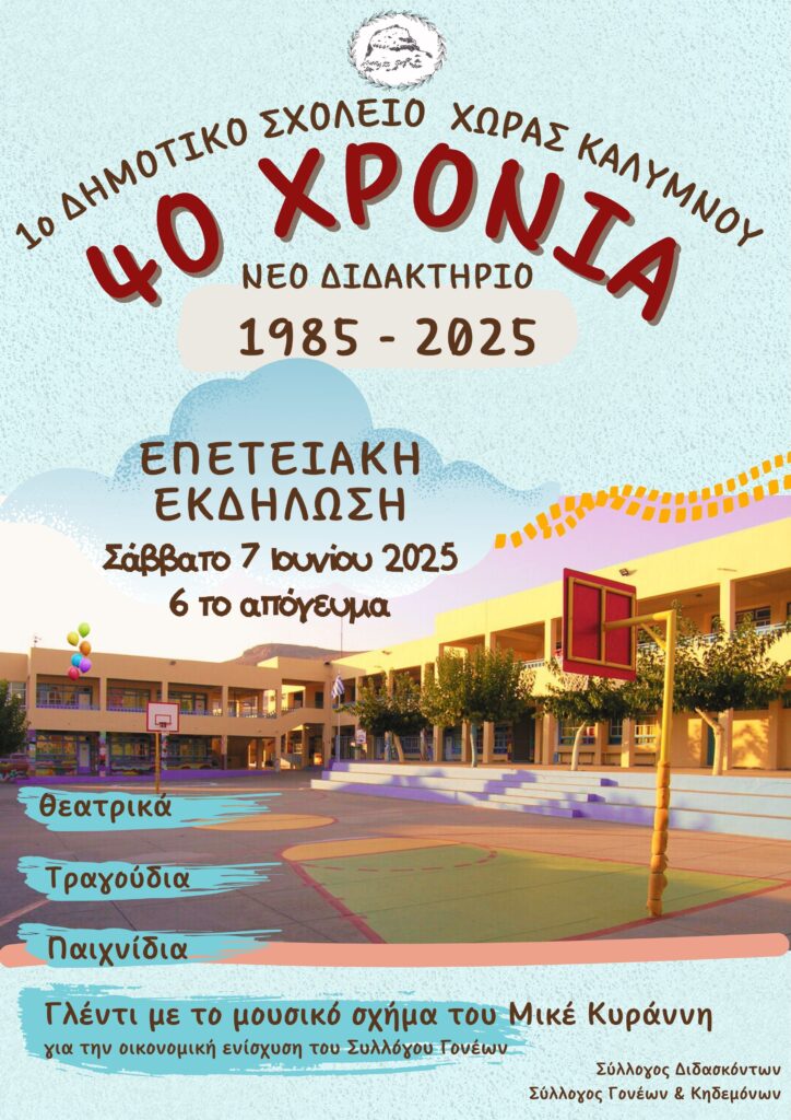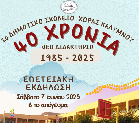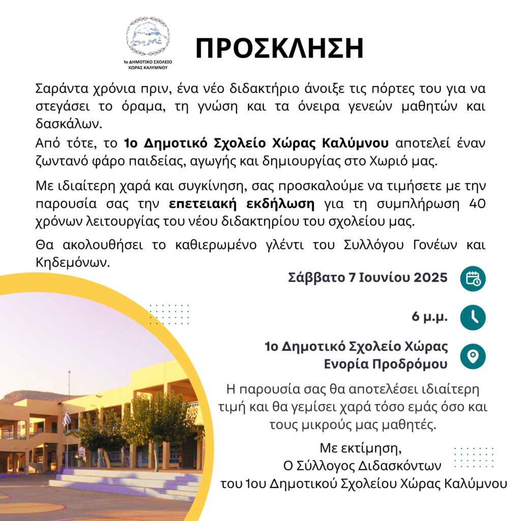 Ο Σύλλογος Διδασκόντων του 1ου Δημοτικού Σχολέιου ενορίας Προδρόμου Χώρας, διοργανώνει επετειακή εκδήλωση για τα 40 χρόνια από την ίδρυση και λειτουργία του Σχολείου. Μετά την επετειακή εκδήλωση, θα ακολουθήσει η καθιερωμένη γιορτή του Συλλόγου Γονέων και Κηδεμόνων του σχολείου.