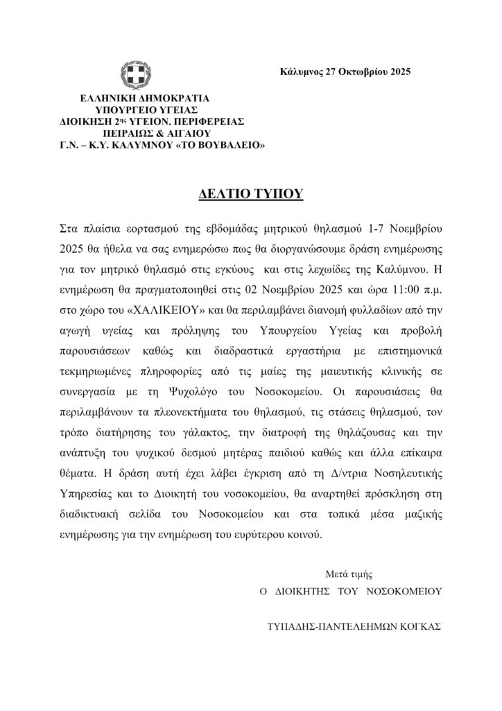 Ο Διοικητής του “Βουβάλειου” Γ. Ν. Καλύμνου, Τυπάδης – Παντελεήμων Κόγκας, ενημερώνει για την δράση ενημέρωσης, που θα πραγαμτοποιηθεί στο Νοσοκομείο (Χαλίκειο) στις 2 Νοεμβρίου 2025 (11:00) στα πλαίσια της Εβδομάδας Μητρικού Θηλασμού, μια σημαντική πρωτοβουλία που διοργανώνεται τα τελευταία χρόνια από την Διοίκηση και το Μαιευτικό Τμήμα του ιδρύματος της Καλύμνου.