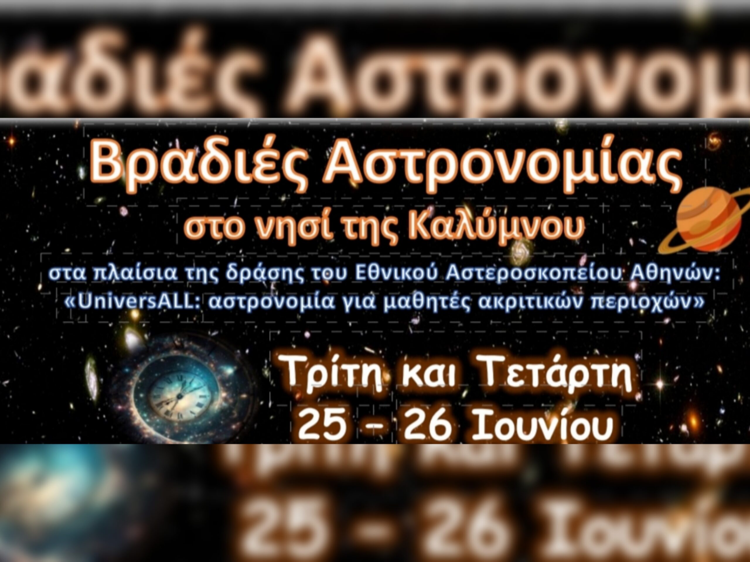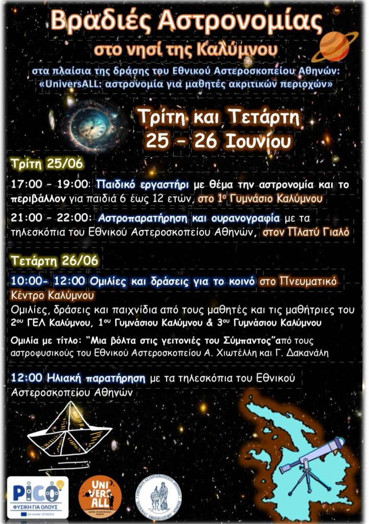 Την Τρίτη 25 και την Τετάρτη 26 Ιουνίου, θα πραγματοποιηθούν στην Κάλυμνο εκδηλώσεις από το Αστεροσκοπείο Αθηνών σε συνεργασία με 3 σχολεία της Καλύμνου, το 2ο ΓΕΛ Καλύμνου και το 1ο και 3ο Γυμνάσιο Καλύμνου.