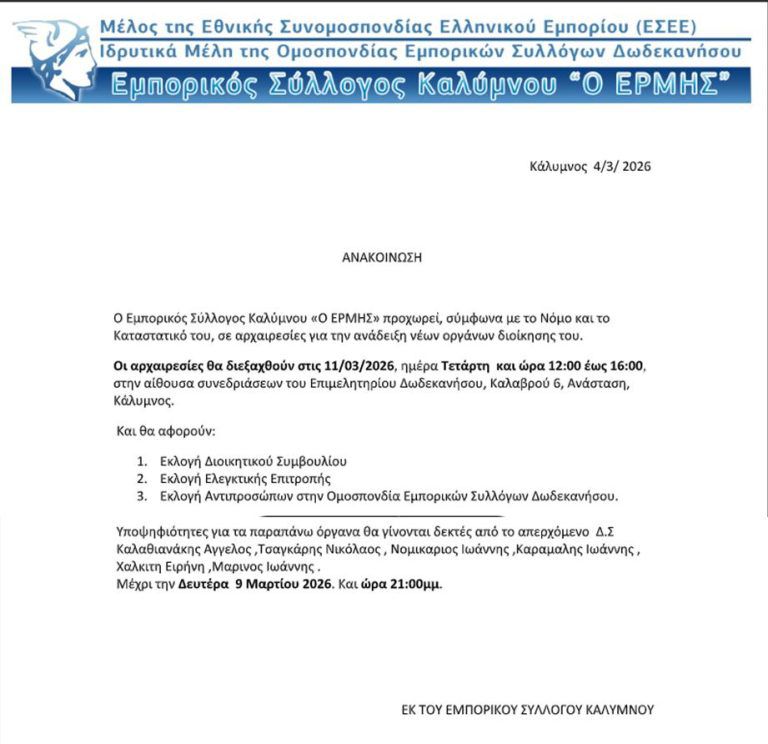 Καλούνται τα μέλη να εκλέξουν νέο Διοικητικό Συμβούλιο, Ελεγκτική Επιτροπή και αντιπροσώπους στην Ομοσπονδία Εμπορικών Συλλόγων Δωδεκανήσου και τονίζεται ότι οι υποψηφιότητες θα κατατίθενται μέχρι τη Δευτέρα 9 Μαρτίου 2026 και ώρα 21:00