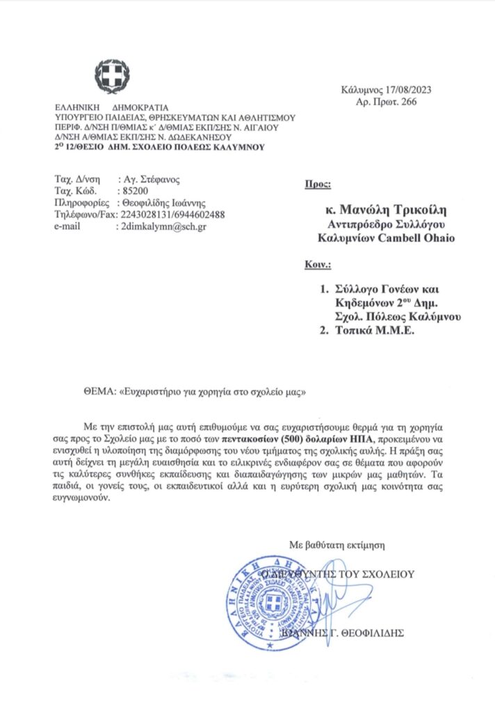 Το 2ο Δημοτικό Σχολείο Πόλεως Καλύμνου ευχαριστεί θερμά τον Αντιπρόεδρο του Συλλόγου Καλυμνίων Cambell Ohaio κ. Μανώλη Τρικοίλη, για τη γενναιόδωρη χορηγία του προς το σχολείο με το ποσό των πεντακοσίων (500) δολαρίων ΗΠΑ, προκειμένου να συμβάλει στα έξοδα διαμόρφωσης του νέου τμήματος της σχολικής αυλής, χώρος που παραχωρήθηκε πρόσφατα στο σχολείο από το Ίδρυμα «Αικατερίνη Νικολάου Βουβάλη».
