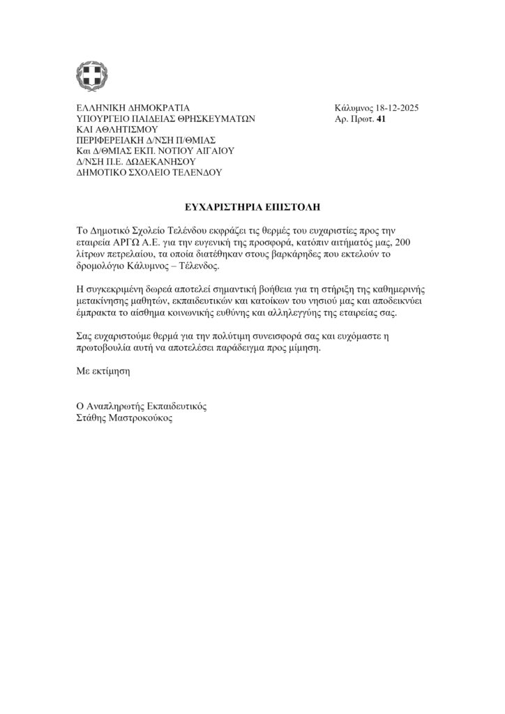 Η Εταιρεία ΑΡΓΩ Α.Ε. της οικογένειας Ψαρομπά, μετά από αίτημα του Δημοτικού Σχολείου της Τελένδου προσέφερε 200 λίτρα πετρέλαιο στους βαρκάρηδες του νησιού, που εξυπηρετούν την μετακίνηση μαθητών, εκπαιδευτικών και κατοίκων,ειδικά την χειμερινή περίοδο που δεν υπάρχει κίνηση.