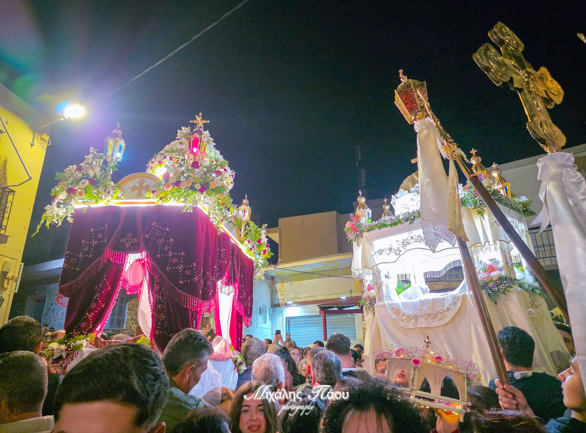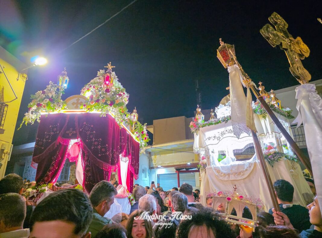 Διασχίζοντας τα στενά του Χωριού, οι Επιτάφιοι από τις τρεις ενορίες, Προδρόμου, Παναγίας και Αγ. Χαραλάμπους, συναντήθηκαν στον Σταθμό, με πλήθος πιστών και τις μελωδίες από τις χορωδίες των Μυροφόρων.