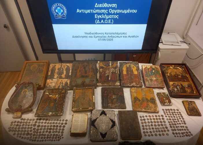 Οι αστυνομικοί πέρασαν χειροπέδες σε άλλα τέσσερα άτομα. Έναν ενεχυροδανειστή και τη σύζυγό του, έναν ιδιώτη που πουλούσε αρχαία νομίσματα και έναν μεσάζοντα.