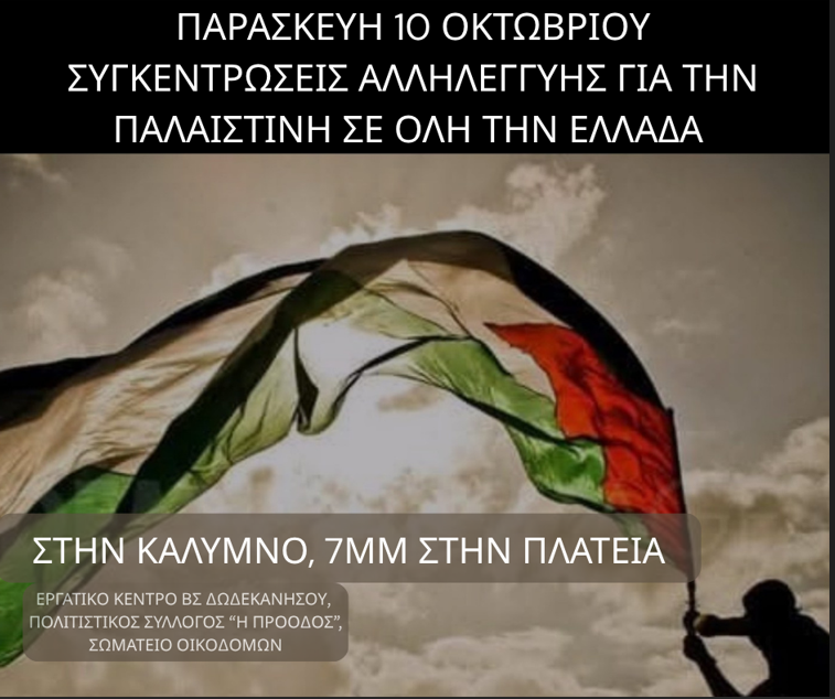 Δεκάδες πρωτοβάθμια σωματεία έχουν προκηρύξει στάσεις εργασίας και έχουν αποφασίσει να συμμετέχουν στις νέες συγκεντρώσεις αλληλεγγύης που διοργανώνονται την Παρασκευή 10 Οκτωβρίου σε όλη την Ελλάδα για να εκφράσουν για άλλη μια φορά την αλληλεγγύη τους στον λαό της Παλαιστίνης.