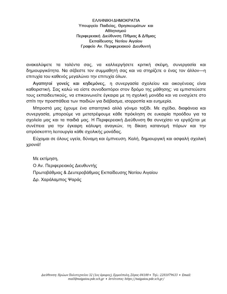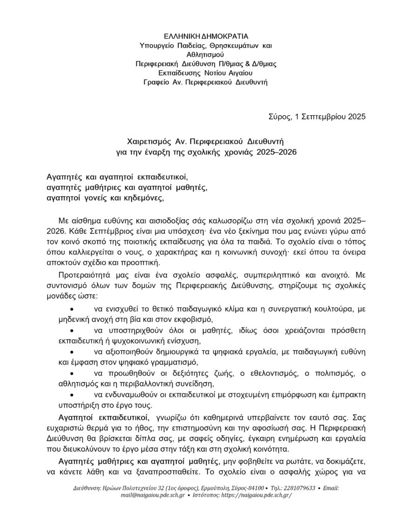 Ο καλυμνιακής καταγωγής, Αν. Περιφερειακός Διευθυντής Πρωτοβάθμιας & Δευτεροβάθμιας Εκπαίδευσης Νοτίου Αιγαίου, Δρ. Χαράλαμπος Ψαράς, με την επίσημη έναρξη της σχολικής χρονιάς 2025–2026, στέλνει μήνυμα προς όλη την εκπαιδευτική κοινότητα και τους γονείς, τονίζοντας πως “Η Περιφερειακή Διεύθυνση θα συνεχίσει να εργάζεται με συνέπεια για την έγκαιρη κάλυψη αναγκών, τη δίκαιη κατανομή πόρων και την απρόσκοπτη λειτουργία κάθε σχολικής μονάδας”.
