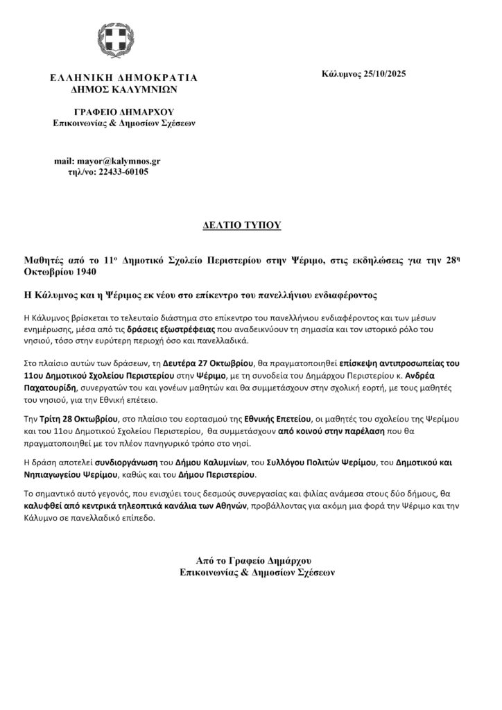 Στην Ψέριμο για τον εορτασμό της επετείου της 28ης Οκτωβρίου 1940, θα βρίσκονται μαθητές από το 11ο Δημοτικό Σχολείο Περιστερίου, που θα συνοδεύονται από τον Δήμαρχο, Ανδρέα Παχατουρίδη, συνεργατών του και γονέων των μαθητών και θα παρελάσουν με τα παιδιά του Νηπιαγωγείου και του Δημοτικού Σχολείου του νησιού.