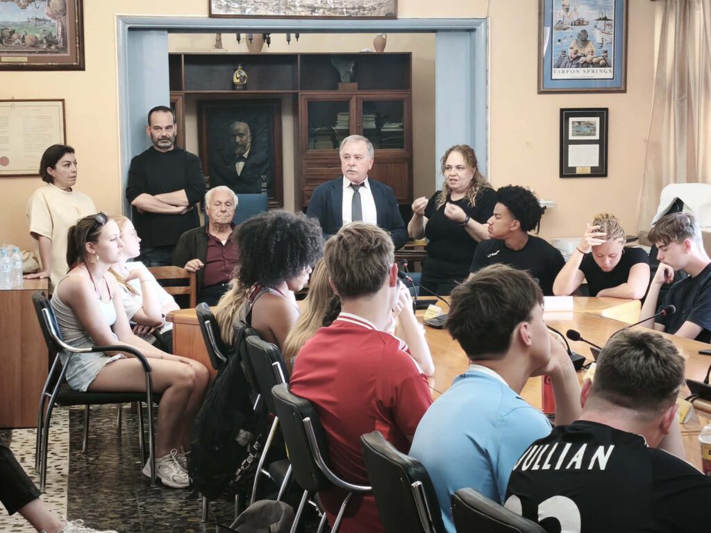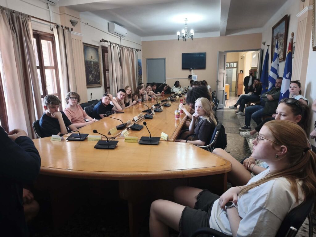 Στο πλαίσιο της επίσκεψής τους, η ομάδα επισκέφθηκε και το Δημοτικό Μέγαρο Καλυμνίων, ως καλεσμένη του Δημάρχου Καλυμνίων, Γιάννη Μαστροκούκου. Την αποστολή στη συγκεκριμένη επίσκεψη συνόδευσε η κα Πουγούνια Ειρήνη, καθηγήτρια του 1ου Λυκείου Καλύμνου «Νικηφόρειο», ενώ παρόντρες ήταν ο πρόεδρος του ΔΣ Δημήτρης Μαραγκός και ο Αντ/χος Βασίλης Μουσελλής.