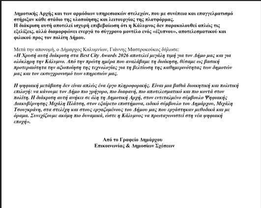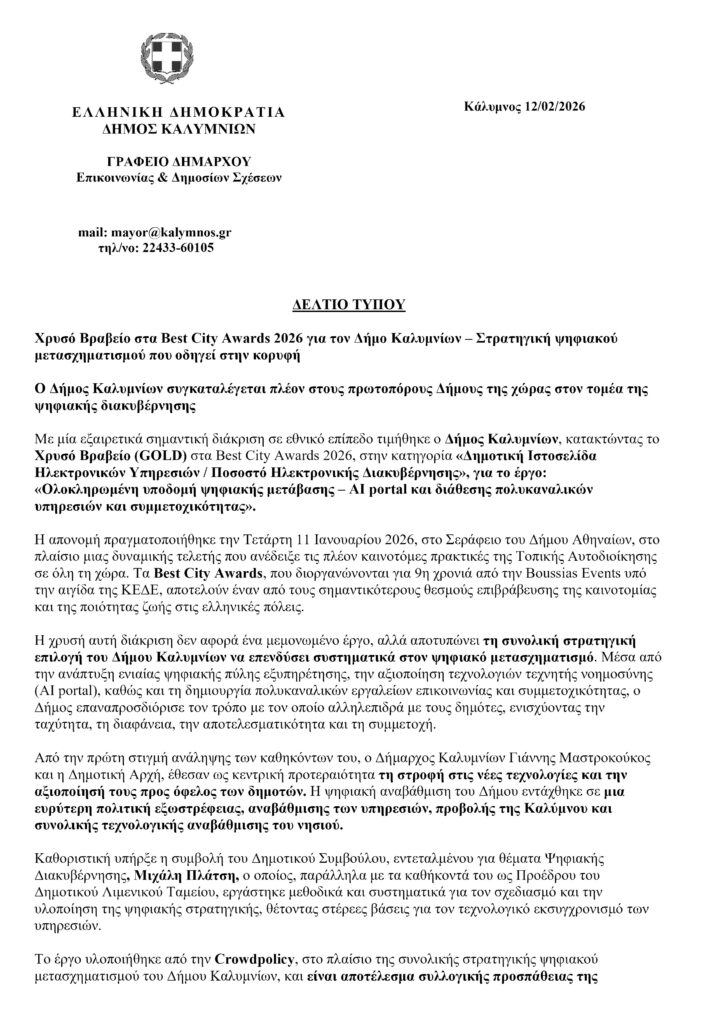Με μία εξαιρετικά σημαντική διάκριση σε εθνικό επίπεδο τιμήθηκε ο Δήμος Καλυμνίων, κατακτώντας το Χρυσό Βραβείο (GOLD) στα Best City Awards 2026, στην κατηγορία «Δημοτική Ιστοσελίδα Ηλεκτρονικών Υπηρεσιών / Ποσοστό Ηλεκτρονικής Διακυβέρνησης», για το έργο: «Ολοκληρωμένη υποδομή ψηφιακής μετάβασης – AI portal και διάθεσης πολυκαναλικών υπηρεσιών και συμμετοχικότητας».