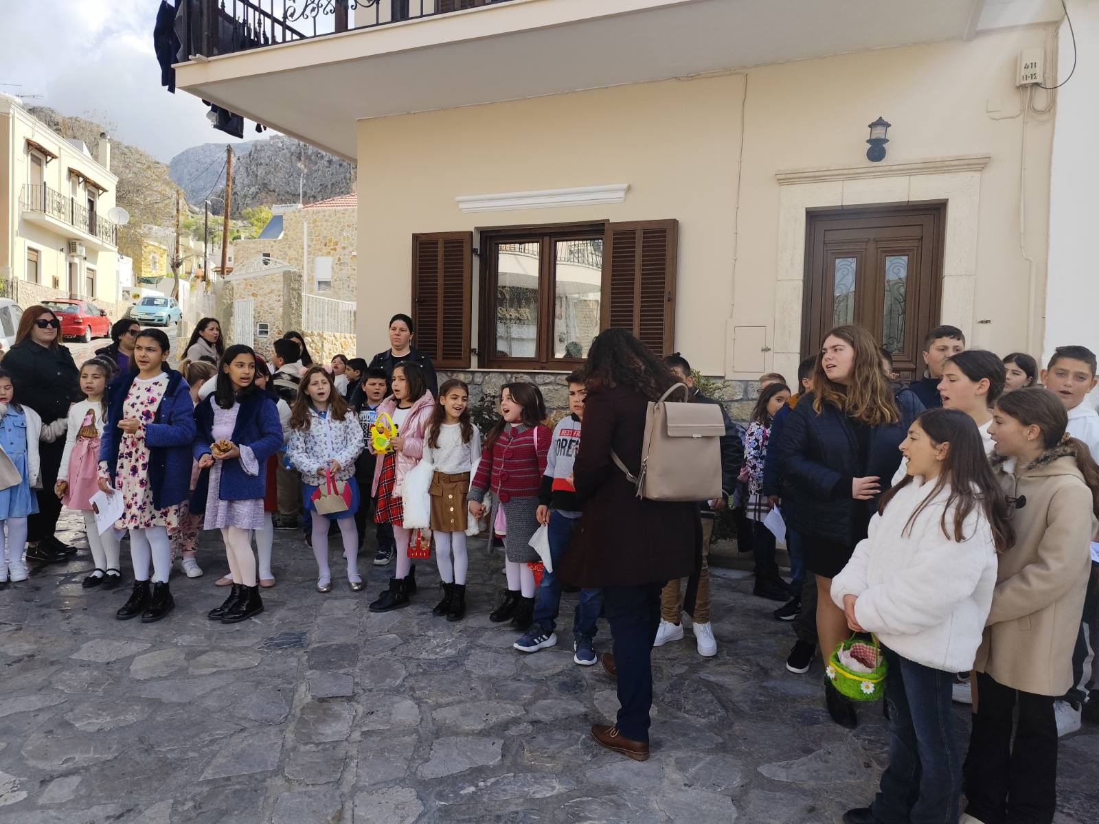Στη συνέχεια με τα Λαζαράκια, που έφτιαξαν χθες μαζί με τον Σύλλογο Γονέων, περιδιάβηκαν τα γραφικά σοκάκια του Χωριού και έψαλαν τα κάλαντα του Λαζάρου.
