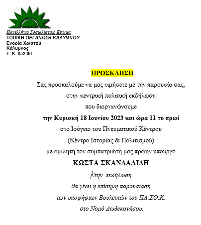 Με επίσημο καλεσμένο και κεντρικό ομιλητή το ιστορικό στέλεχος του ΠΑΣΟΚ και πρώην υπουργό, Κώστα Σκανδαλίδη, αλλά και με την συμμετοχή της ομάδας των πρώην βουλευτών της Δωδεκανήσου του κινήματος, θα γίνει η πολιτική εκδήλωση την Κυριακή 18 Ιουνίου στις 11:00 το πρωί στο ισόγειο του Πνευματικού Κέντρου. Στην εκδήλωση θα συμμετάσχουν και οι υποψήφιοι βουλευτές του κόμματος στα Δωδεκάνησα.
