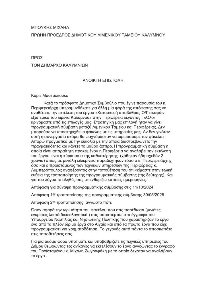 Παραθέτουμε την επιστολή του Μ. Μπούκη όπως δόθηκε στην δημοσιότητα και ένα σύντομο ιστορικό με το λιμάνι της Καλύμνου: