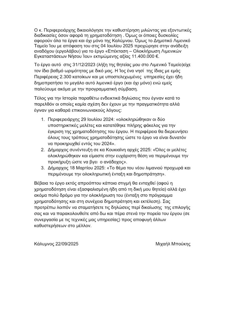 Επιπλέον αναφέρει στην σημερινή επιστολή, πως είχε παραδώσει στην νέα Δημοτική Αρχή πλήρες φάκελο και το έργο ήταν έτοιμο για χρηματοδότηση, παραπέμποντας «στα έγγραφα του Υπουργείου Ναυτιλίας και Νησιωτικής Πολιτικής που χαρακτήριζαν το έργο ένα από τα πλέον ώριμα έργα στο Αιγαίο και από τα πρώτα έργα που είχε προγραμματίσει για χρηματοδότηση». Είναι προφανές πως ο τ. πρόεδρος του Λιμενικού Ταμείου καταλογίζει καθυστερήσεις στην Περιφέρεια για την πρόοδο του έργου, που – κατά την γνώμη του – το 2024, όταν παρέδωσε, ήταν έτοιμο για χρηματοδότηση.