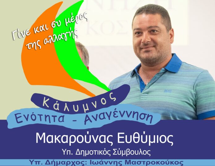 Αποφάσισε να συμμετάσχει στον αγώνα μας για μια καλύτερη Κάλυμνο, της αξιοπιστίας , της σταθερότητας ,της εξωστρέφειας .Αγαπάει με πάθος το νησί και επιθυμεί να αγωνιστεί για ένα καλύτερο αύριο.