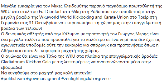 Ο Μικές Κλειδομύτης, παγκόσμιος πρωταθλητής της WKU στο Full Contact στα 65 κιλά στη Ρόδο, θα αγωνιστεί 31 Οκτωβρίου στη Γερμανία στο πλαίσιο της διοργάνωσης ‘Gladiatorum Kickbox Gala’.