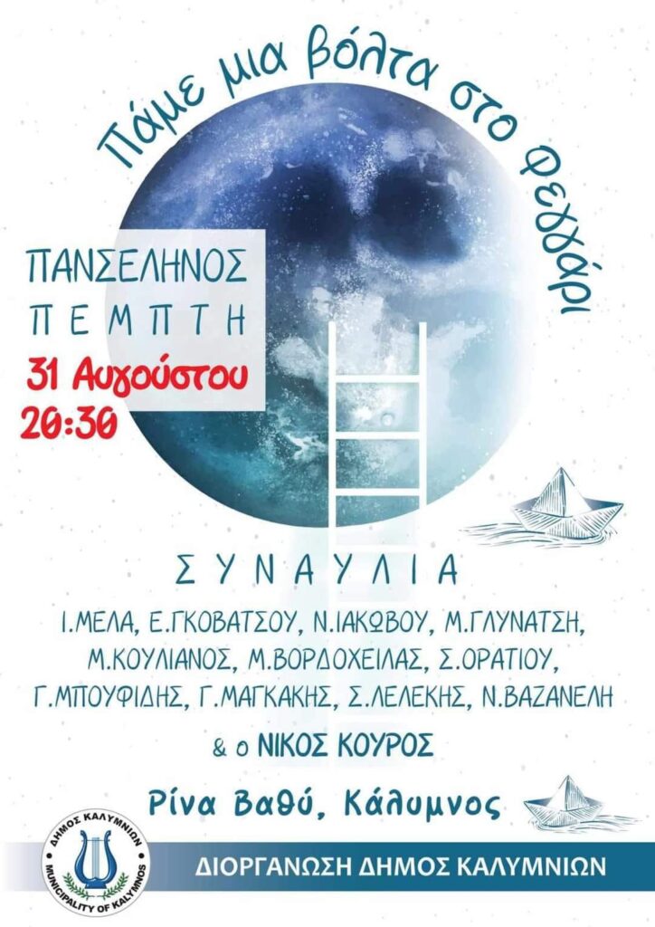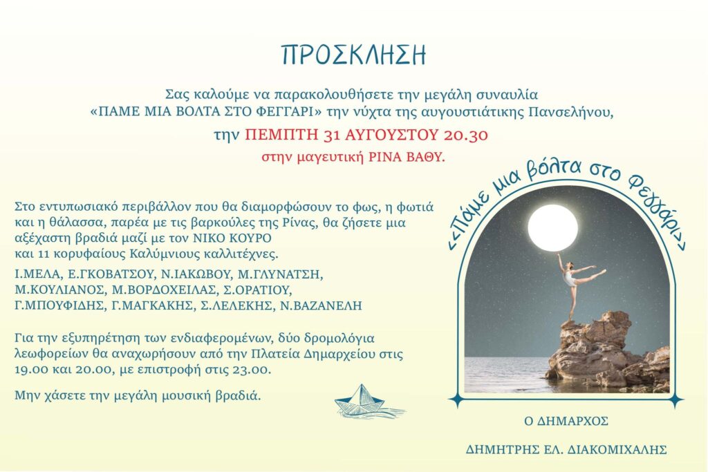 Την Πέμπτη 31 Αυγούστου στις 8:30 μ.μ., ο Δήμος διοργανώνει συναυλία στη Ρίνα του Βαθύ, με τον τίτλο “Πάμε μια βόλτα στο Φεγγάρι”, για την υποδοχή της Αυγουστιάτικης Πανσελήνου, με τον Νίκο Κούρο και 11 Καλύμνιους Καλλιτέχνες. Για την εξυπηρέτηση του κοινού, θα υπάρξουν δύο δρομολόγια στις 7:30 και στις 8:00 μ.μ. που θα αναχωρήσουν από την πλατεία Δημαρχείου με επιστροφή στις 11:00 το βράδυ.