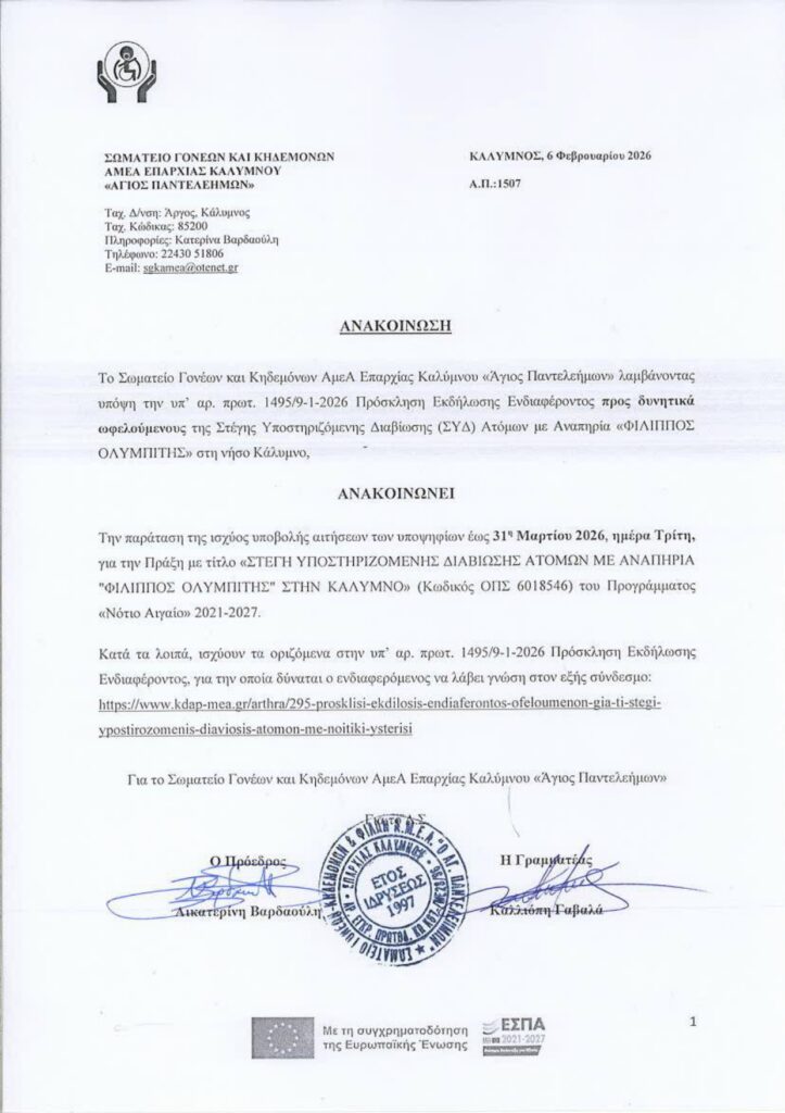Μέχρι της 31 Μαρτίου 2026, παρατείνεται η προθεσμία υποβολής αιτήσεων για τους δυνητικά υποψήφιους ωεφελούμενους για την Στέγη Υποστηριζόμενης Διαβίωσης (ΣΥΔ) ΑμεΑ, “Φίλιππος Ολυμπίτης”, όπως ανακοινώνει το σωματείο Γονέων και Κηδεμόνων Επαρχίας Καλύμνου ΑμεΑ, “Άγιος Παντελεήμων”