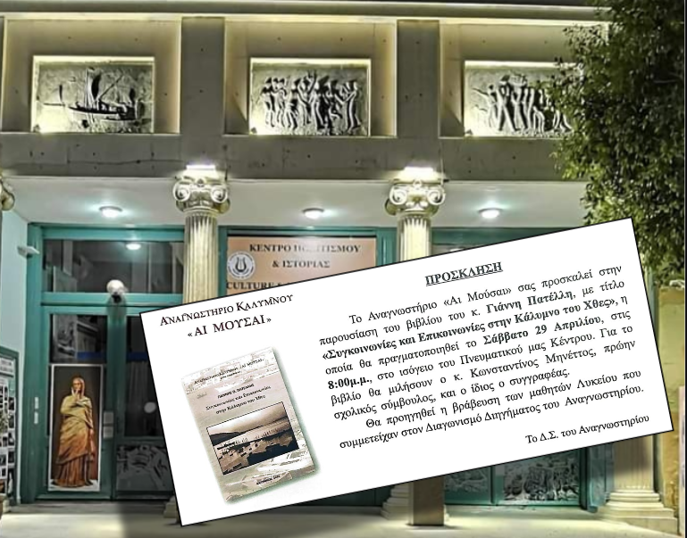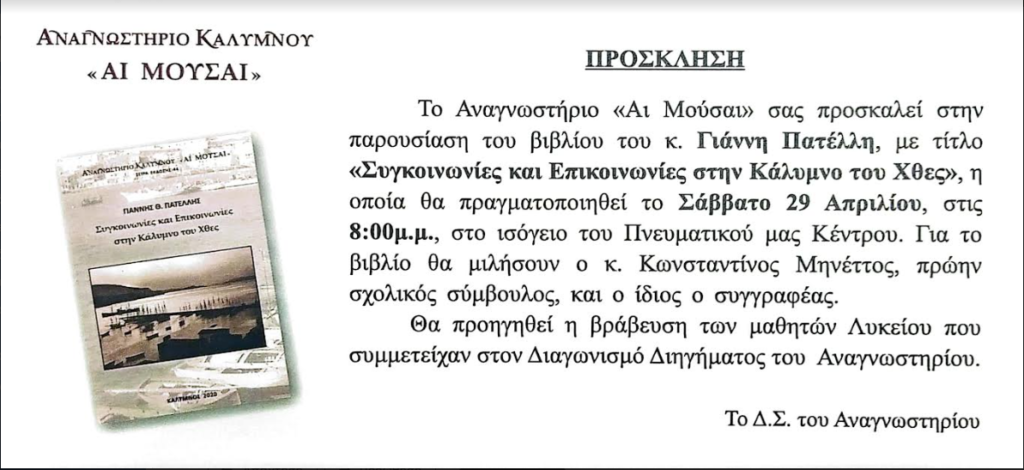 Το Σάββατο 29 Απριλίου στις 20:00, θα γίνει από το Αναγνωστήριο Καλύμνου “Αι Μούσαι”, η παρουσίαση του Γιάννη Πατέλλη με τίτλο:“Συγκοινωνίες και επικοινωνίες στην Κάλυμνο του Χθες” στον ισόγειο χώρο του Αναγνωστηρίου και παράλληλα η βράβευση των μαθητών Λυκείου που συμμετείχαν στο Διαγωνισμό διηγήματος του Αναγνωστηρίου