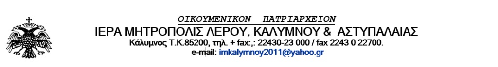Η Μητρόπολις μας, πληροφορεί τις Αρχές και τον λαόν της Καλύμνου, ότι θα εορτάσει και εφέτος τον πολιούχον της και Θαλασσάρχην Άγιον Νικόλαον. Όπως γνωρίζετε είναι ΑΡΓΙΑ η εορτή του Αγίου για όλες τις Δημόσιες Υπηρεσίες, τα Σχολεία κλπ. σύμφωνα με το Προεδρικό Διάταγμα ΦΕΚ 125/23-5-2003.