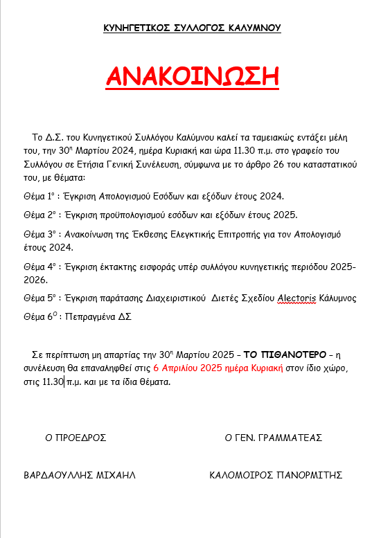 Πρόσκληση για Γενική Συνέλευση του Κυνηγετικού Συλλόγου Καλύμνου στις 30 Μαρτίου