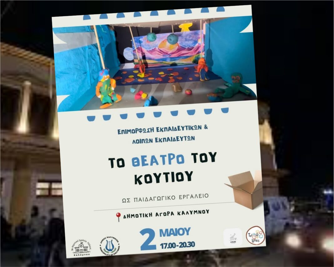 Την Παρασκευή 2 Μαϊου, από τις 5 μ.μ. έως τις 8.30 μ.μ. στον χώρο της Δημοτικής Αγοράς, θα γίνει επιμόρφωση εκπαιδευτικών αλλά και γονέων, για τη χρήση του «Θεάτρου του Κουτιού», ως εκπαιδευτικού εργαλείου.