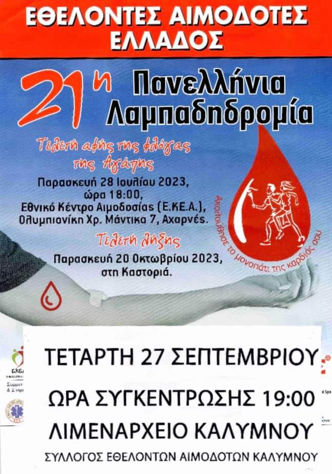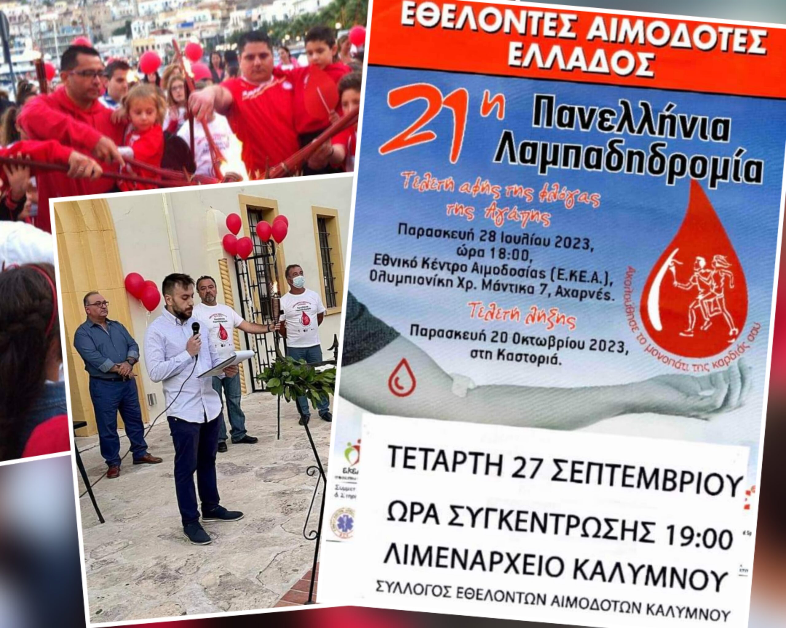 Η φλόγα των Εθελοντών Αιμοδοτών, έχει ξεκινήσει το ταξίδι της μέσα στο καλοκαίρι και θα ολοκληρωθεί στις 20 Οκτωβρίου, με το ραντεβού αφής της φλόγας της ελπίδας, του εθελοντισμού και της αγάπης στον άνθρωπο, στην Κάλυμνο, να είναι φέτος την Τετάρτη 27 Σεπτεμβρίου.