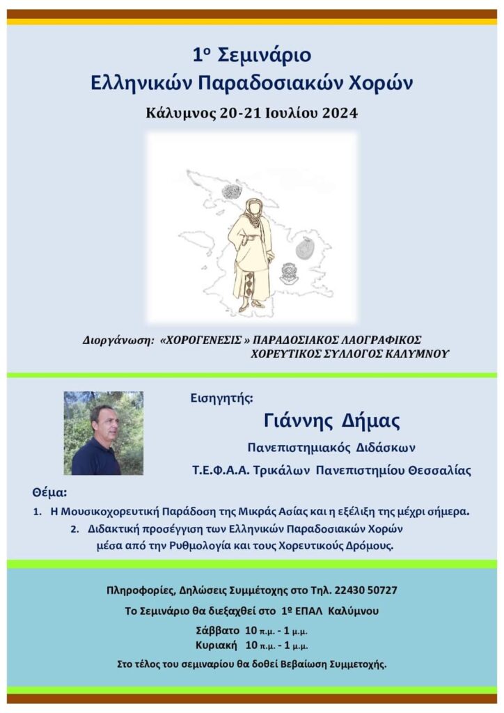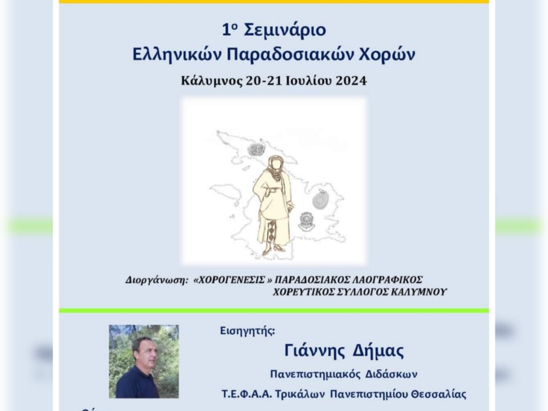 Ο Παραδοσιακός Λαογραφικός Σύλλογος Καλύμνου “ΧΟΡΟΓΕΝΝΕΣΙΣ”, της Ευφροσύνης Τρουμουλιάρη , διοργανώνει το 1ο Σεμινάριο Παραδοσιακού Χορού, στις 20-21 Ιουλίου 2024 με εισηγητή τον Πανεπιστημιακό Διδάσκοντα , Καθηγητή Φυσικής Αγωγής και Παιδαγωγό του Ελληνικού Παραδοσιακού Χορού, στο ΤΕΦΑΑ Τρικάλων, Γιάννη Δήμα.