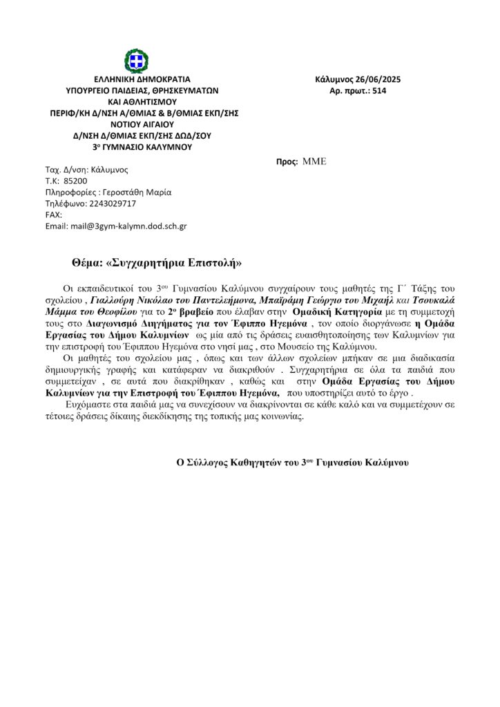 Οι εκπαιδευτικοί του 3ου Γυμνασίου Καλύμνου συγχαίρουν τους μαθητές της Γ΄ Τάξης του σχολείου , Γιαλλούρη Νικόλαο του Παντελεήμονα, Μπαϊράμη Γεώργιο του Μιχαήλ και Τσουκαλά Μάμμα του Θεοφίλου για το 2ο βραβείο που έλαβαν στην  Ομαδική Κατηγορία με τη συμμετοχή τους στο Διαγωνισμό Διηγήματος για τον Έφιππο Ηγεμόνα , τον οποίο διοργάνωσε η Ομάδα Εργασίας του Δήμου Καλυμνίων  ως μία από τις δράσεις ευαισθητοποίησης των Καλυμνίων για την επιστροφή του Έφιππου Ηγεμόνα στο νησί μας , στο Μουσείο της Καλύμνου.