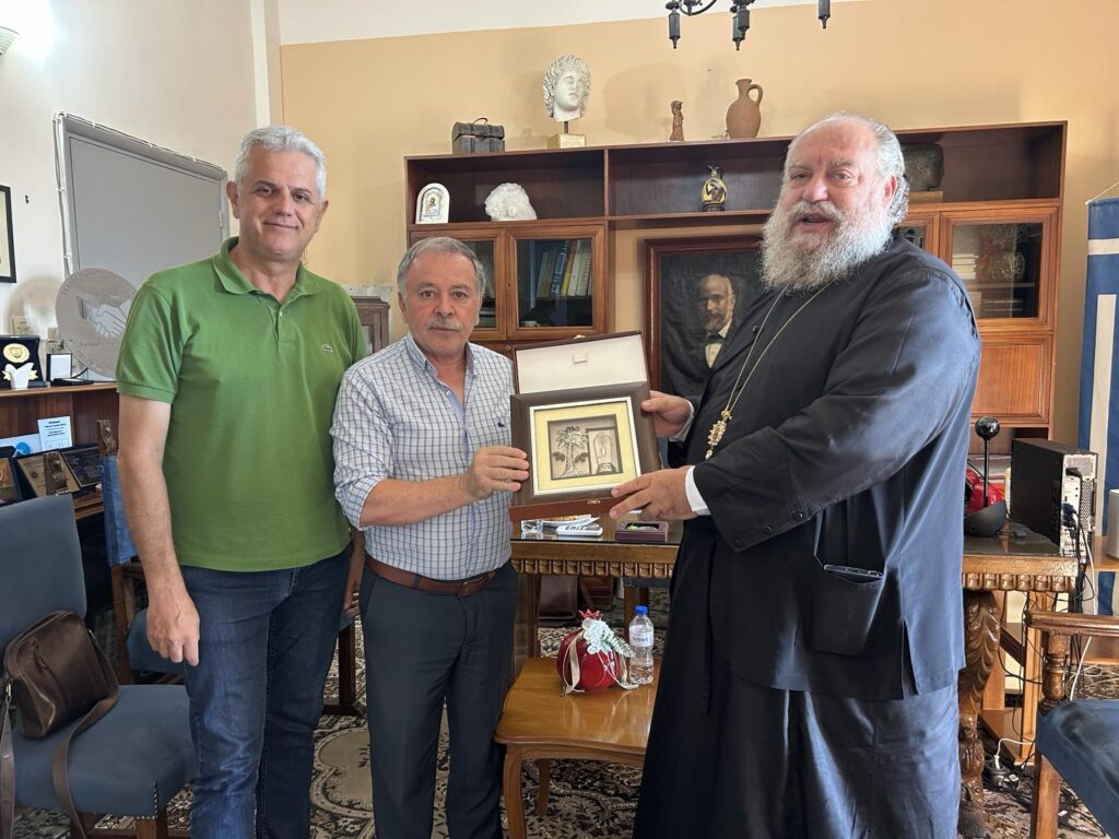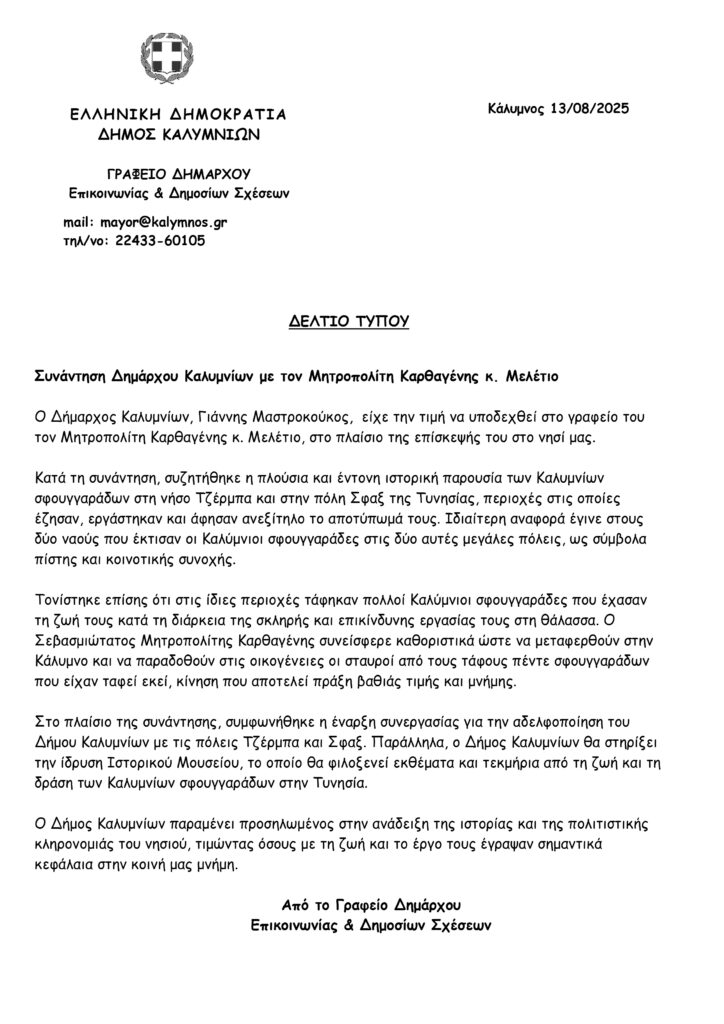 Ο Δήμαρχος Καλυμνίων, Γιάννης Μαστροκούκος, είχε την τιμή να υποδεχθεί στο γραφείο του τον Μητροπολίτη Καρθαγένης κ. Μελέτιο, στο πλαίσιο της επίσκεψής του στο νησί μας. Κατά τη συνάντηση, συζητήθηκε η πλούσια και έντονη ιστορική παρουσία των Καλυμνίων σφουγγαράδων στη νήσο Τζέρμπα και στην πόλη Σφαξ της Τυνησίας, περιοχές στις οποίες έζησαν, εργάστηκαν και άφησαν ανεξίτηλο το αποτύπωμά τους.