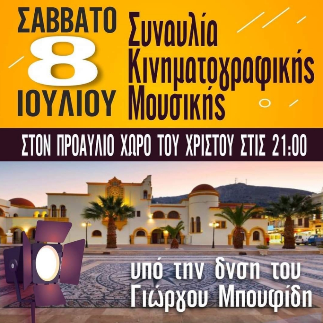 Το Σάββατο 8 Ιουλίου και ώρα 21.00, στον προαύλιο   χώρο του Μητροπολιτικού Ναού του Σωτήρος Χριστού, διοργανώνεται  συναυλία  κινηματογραφικής μουσικής, υπό τη  διεύθυνση του εκλεκτού μουσικού μας κ. Γιώργου Μπουφίδη.