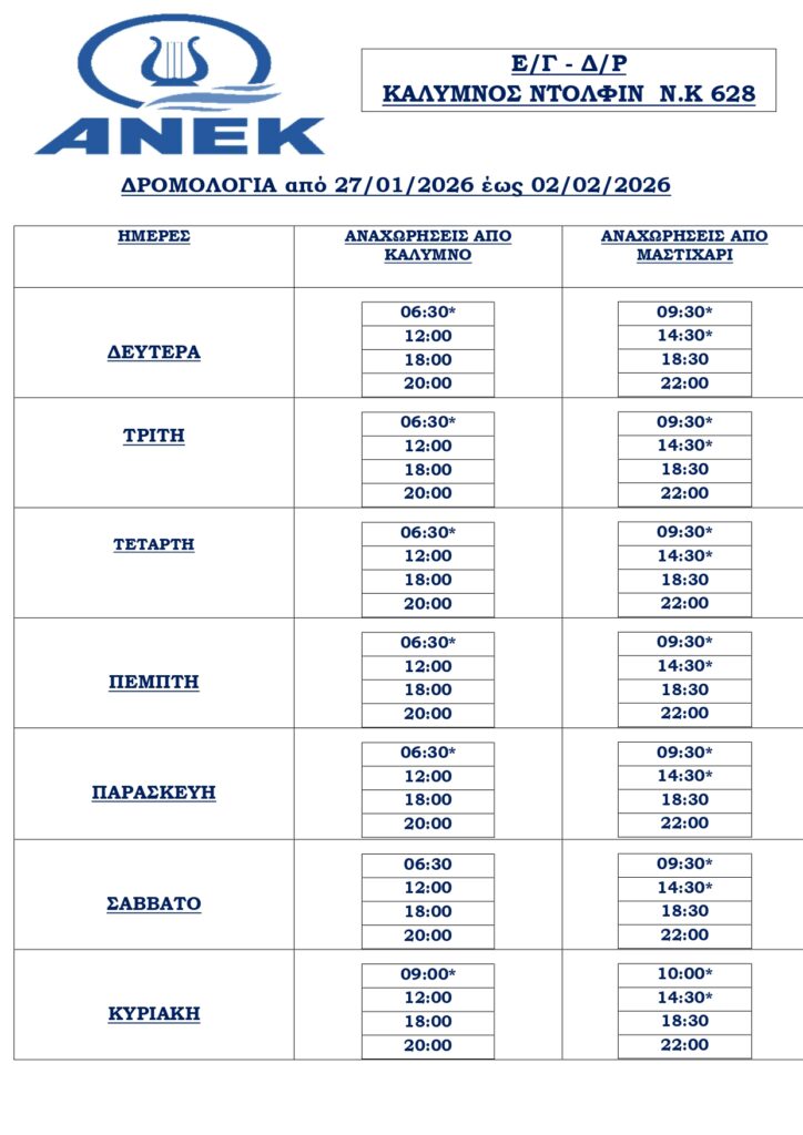 ΔωδεκάνησαΠροτεινόμενα ΆρθραΤοπικά Νέα Τα δρομολόγια του “Κάλυμνος Ντόλφιν” για την περίοδο από 27/01 έως 02/02/2026 By Διαχειριστής - 27 Ιανουαρίου 2026 Κοινοποίηση: Από την ΑΝΕΚ ανακοινώθηκαν τα δρομολόγια του πλοίου “Κάλυμνος Ντόλφιν”, στη γραμή Κάλυμνος – Ψέριμος Μαστιχάρι (Με αστερίσκους είναι τα δρομολόγια μέσω Ψερίμου) για την περίοδο από 27 Ιανουαρίου έως 2 Φεβρουαρίου 2026 Κοινοποίηση: