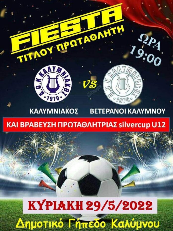 Στα πλαίσια του εορτασμού του τίτλου και της ανόδου κατηγορίας, θα γίνει φιλικός αγώνας μεταξύ Καλυμνιακού και Βετεράνων Καλύμνου, ενώ θα ακολουθήσει η βράβευση της Πρωταθλήτριας και θα υπάρξουν πολλές εκπλήξεις.