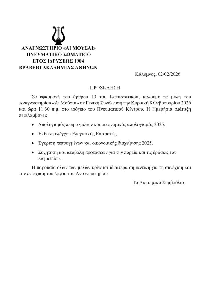 Η αναβληθείσα Γενική Συνέλευση του Σωματείου, “Αι Μούσαι”, θα πραγματοποιηθεί την ερχόμενη Κυριακή, 8 Φεβρουαρίου 2026, στις 11:30 π.μ. στο ισόγειο του Πνευματικού Κέντρου.