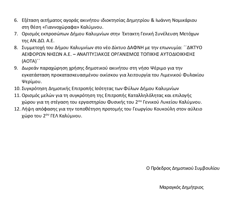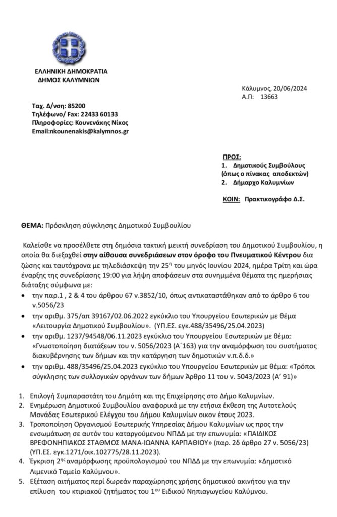Σύμφωνα με την πρόσκληση που εστάλη στους δημοτικούς συμβούλους, την Τρίτη 25 Ιουνίου θα γίνει η, εξ αναβολής, συνεδρίαση του Δημοτικού Συμβουλίου Καλύμνου. Στο πινάκιο θα περιλαμβάνονται 12 θέματα.